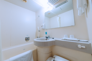 歯ブラシ、お茶(ほうじ茶/緑茶)、シャンプー、ボディソープ、フェイスタオル、バスタオル、バスマット、靴掃除機、ティッシュ、かみそり(フロントで購入可能)